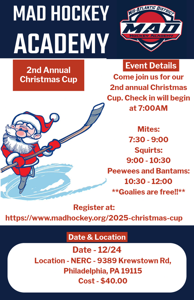 Registration FormFields marked with an * are required.error_outline Some fields contain errors Show {{form.showErrors ? 'Less' : 'More'}}keyboard_arrow_down {{error.field}} - {{error.message}} Player's NameFirst NameLast NameEmailCurrent Level8u10u12u14uCurrent Travel TeamPositionForwardDefenseGoalieRegistration FeePrice$40.00PaymentCouponApplyDiscountSubtotalTaxTotal USDSubmitThank you for registering for the 2023 Christmas Cup. Below you find the links to pay for the event:8Uhttps://bondsports.co/activity/programs/CO_ED-youth-HOCKEY/3215/season/1st%20Annual%20Christmas%20Cup%20-%208U/25748 10Uhttps://bondsports.co/activity/programs/CO_ED-youth-HOCKEY/3215/season/1st%20Annual%20Christmas%20Cup%20-%2010U/25749 12/14Uhttps://bondsports.co/activity/programs/CO_ED-youth-HOCKEY/3215/season/1st%20Annual%20Christmas%20Cup%20-%2012U%2F14U/25750We look forward to having you at the event!MAD Hockey Academy